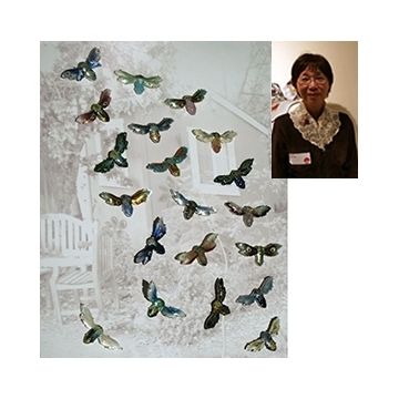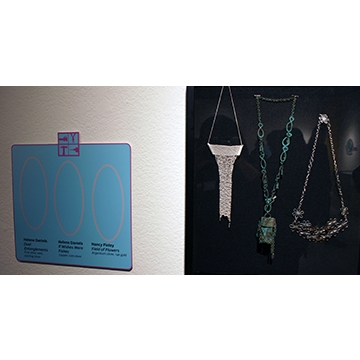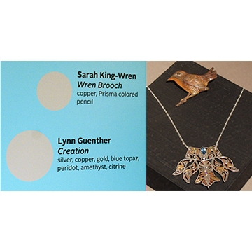 We, the artists, happily found our names on the walls of the museum near the metal art we had created. Necklaces by Helene Daniels and Nancy Finley, the “Wasp” by Emmy MacKenzie, “The Swarm” by Nancy Yee, and the “Wren” brooch by Sarah King-Wren are some of the 65 pieces on exhibit for the first time, all of which were created by 39 members of the Monterey Bay Metal Arts Guild (MBMAG).